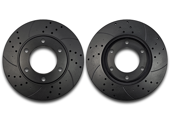 • Перфорация и слотирование: Диски изготовлены с неполной перфорацией и дуговыми слотами, для удаления газа и пыли возникающих при трении, что обеспечивает наилучший коэффициент трения тормозного диска и колодки.